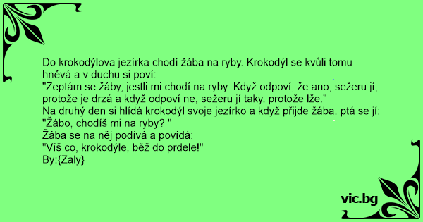 Do krokodýlova jezírka chodí žába na ryby. Krokodýl se kvůli tomu hněvá a v duchu si poví: