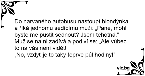Do narvaného autobusu nastoupí blondýnka a říká jednomu sedícímu muži: „Pane, mohl byste mě pustit sednout? Jsem těhotná.”