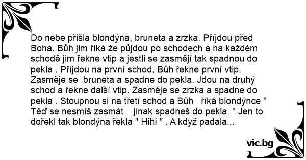 Do nebe přišla blondýna, bruneta a zrzka. Příjdou před Boha. Bůh jim říká že půjdou po schodech a na každém schodě jim řekne vtip a jestli se zasmějí tak spadnou do pekla . Příjdou na první schod, Bůh řekne první vtip. Zasměje se bruneta a spadne do pekla. Jdou na druhý schod a řekne další vtip. Zasměje se zrzka a spadne do pekla . Stoupnou si na třetí schod a Bůh říká blondýnce " Těď se nesmíš zasmát jinak spadneš do pekla. " Jen to dořekl tak blondýna řekla " Hihi " . A když padala Bůh za ní volal " Proč si se zasmála ?!" A Blondýna na to " Mě došel ten první vtip !!!"