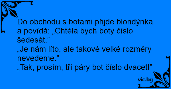 Do obchodu s botami přijde blondýnka a povídá: „Chtěla bych boty číslo šedesát.”