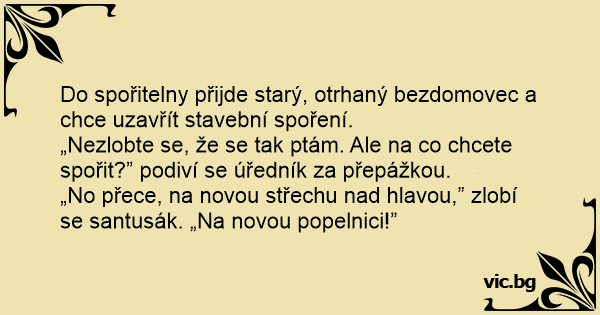 Do spořitelny přijde starý, otrhaný bezdomovec a chce uzavřít stavební spoření.