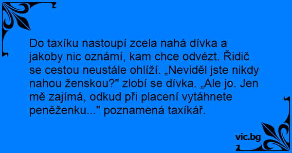 Do taxíku nastoupí zcela nahá dívka a jakoby nic oznámí, kam chce odvézt. Řidič se cestou neustále ohlíží. „Neviděl jste nikdy nahou ženskou?" zlobí se dívka. „Ale jo. Jen mě zajímá, odkud při placení vytáhnete peněženku..." poznamená taxíkář.