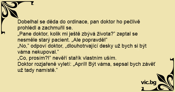 Doktor rozjařeně vyletí: „Apríl! Být váma, sepsal bych závěť už tady namístě.”