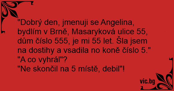 "Dobrý den, jmenuji se Angelina, bydlím v Brně, Masaryková ulice 55, dům číslo 555, je mi 55 let. Šla jsem na dostihy a vsadila no koně číslo 5."