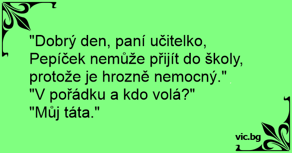 "Dobrý den, paní učitelko, Pepíček nemůže přijít do školy, protože je hrozně nemocný."