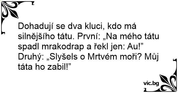 Dohadují se dva kluci, kdo má silnějšího tátu. První: „Na mého tátu spadl mrakodrap a řekl jen: Au!”