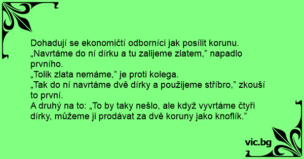 A druhý na to: „To by taky nešlo, ale když vyvrtáme čtyři dírky, můžeme ji prodávat za dvě koruny jako knoflík.”