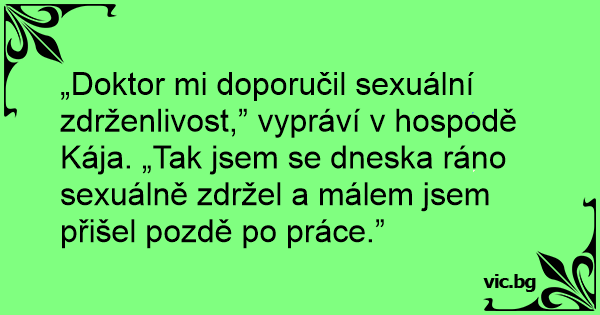 „Doktor mi doporučil sexuální zdrženlivost,” vypráví v hospodě Kája. „Tak jsem se dneska ráno sexuálně zdržel a málem jsem přišel pozdě po práce.”