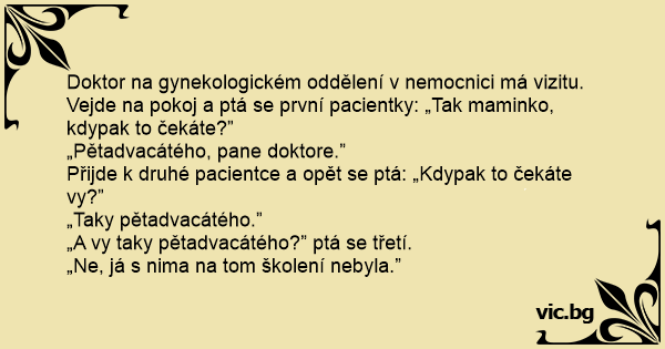 Doktor na gynekologickém oddělení v nemocnici má vizitu. Vejde na pokoj a ptá se první pacientky: „Tak maminko, kdypak to čekáte?”