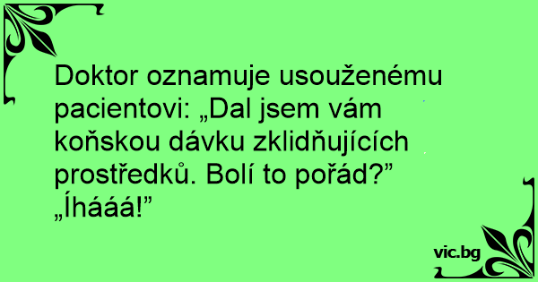 Doktor oznamuje usouženému pacientovi: „Dal jsem vám koňskou dávku zklidňujících prostředků. Bolí to pořád?”