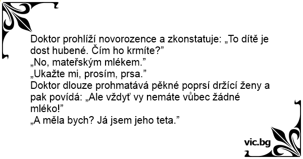 Doktor dlouze prohmatává pěkné poprsí držící ženy a pak povídá: „Ale vždyť vy nemáte vůbec žádné mléko!”