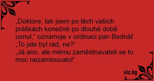 „Doktore, tak jsem po těch vašich práškách konečně po dlouhé době usnul,” oznamuje v ordinaci pan Bednář.