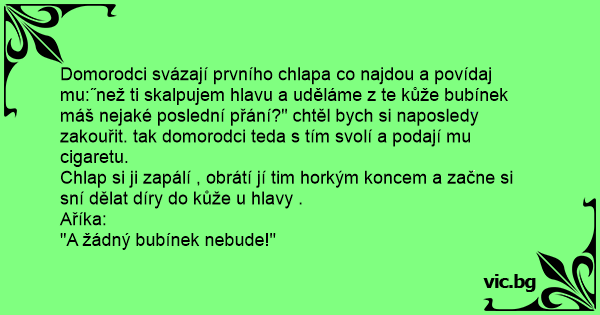 Domorodci svázají prvního chlapa co najdou a povídaj mu:˝než ti skalpujem hlavu a uděláme z te kůže bubínek máš nejaké poslední přání?" chtěl bych si naposledy zakouřit. tak domorodci teda s tím svolí a podají mu cigaretu.