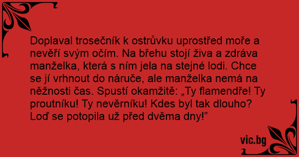 Doplaval trosečník k ostrůvku uprostřed moře a nevěří svým očím. Na břehu stojí živa a zdráva manželka, která s ním jela na stejné lodi. Chce se jí vrhnout do náruče, ale manželka nemá na něžnosti čas. Spustí okamžitě: „Ty flamendře! Ty proutníku! Ty nevěrníku! Kdes byl tak dlouho? Loď se potopila už před dvěma dny!”