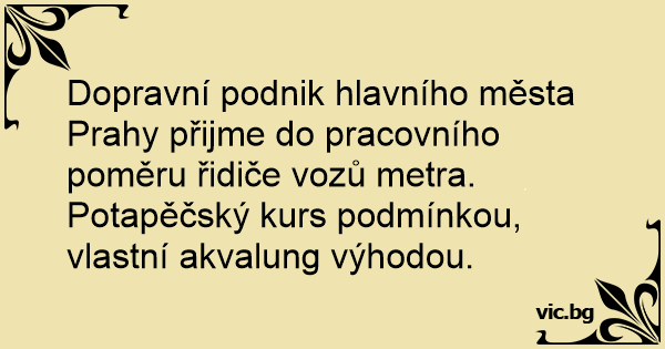 Dopravní podnik hlavního města Prahy přijme do pracovního poměru řidiče vozů metra. Potapěčský kurs podmínkou, vlastní akvalung výhodou.