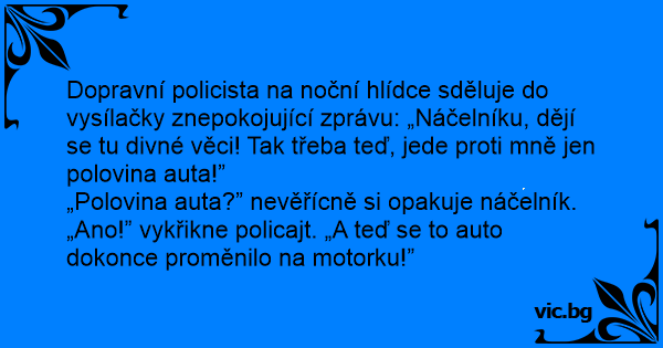 Dopravní policista na noční hlídce sděluje do vysílačky znepokojující zprávu: „Náčelníku, dějí se tu divné věci! Tak třeba teď, jede proti mně jen polovina auta!”