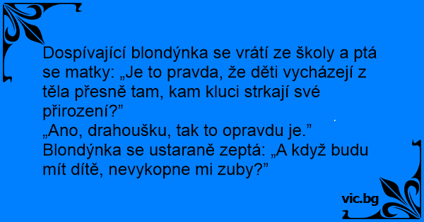 Dospívající blondýnka se vrátí ze školy a ptá se matky: „Je to pravda, že děti vycházejí z těla přesně tam, kam kluci strkají své přirození?”