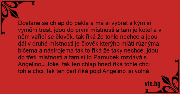 Dostane se chlap do pekla a má si vybrat s kým si vymění trest. jdou do první místnosti a tam je kotel a v něm vařící se člověk. tak říká že tohle nechce a jdou dál v druhé místnosti je člověk kterýho mlátí různýma bičema a nástrojema tak to říká že taky nechce. jdou do třetí místnosti a tam si to Paroubek rozdává s Angelinou Jolie. tak ten chlap hned říká tohle chci tohle chci. tak ten čert říká pojd Angelino jsi volná.