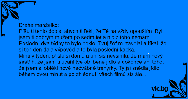 Píšu ti tento dopis, abych ti řekl, že Tě na vždy opouštím. Byl jsem ti dobrým mužem po sedm let a nic z toho nemám.