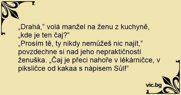 „Drahá,” volá manžel na ženu z kuchyně, „kde je ten čaj?”