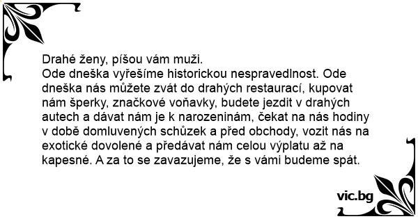 Ode dneška vyřešíme historickou nespravedlnost. Ode dneška nás můžete zvát do drahých restaurací, kupovat nám šperky, značkové voňavky, budete jezdit v drahých autech a dávat nám je k narozeninám, čekat na nás hodiny v době domluvených schůzek a před obchody, vozit nás na exotické dovolené a předávat nám celou výplatu až na kapesné. A za to se zavazujeme, že s vámi budeme spát.