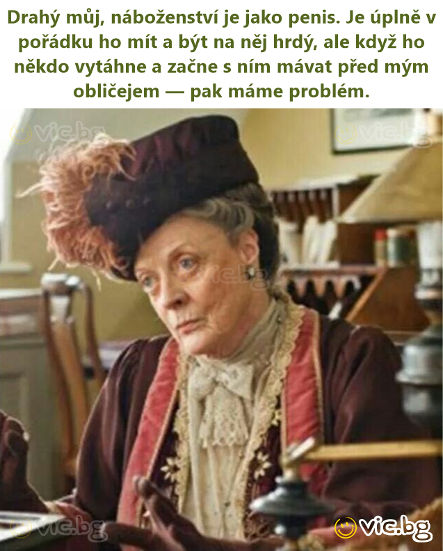 Скъпи мой, религията е като пeниc. Напълно нормално е човек да има такъв и дори да се гордее с него, но когато го извади и започне да ми го размахва пред лицето — тогава вече имаме проблем.