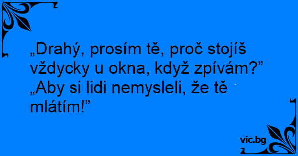 Комшии прават муабет: - Комшија зашто додека жена ти пее, ти секогаш излагаш надвор, или на тераса или на улица? - Па да, не сакам комшиите да помислат дека ја тепам!!
