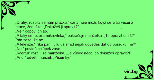 „Drahý, rozbila se nám pračka,” oznamuje muži, když se vrátí večer z práce, ženuška. „Dokážeš ji opravit?”