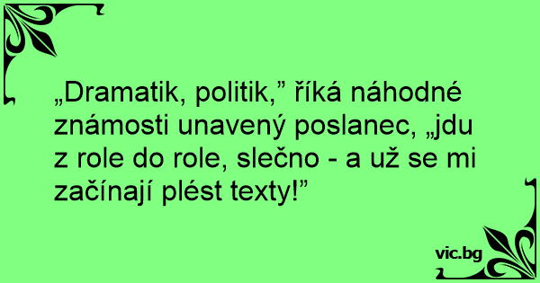 „Dramatik, politik,” říká náhodné známosti unavený poslanec, „jdu z role do role, slečno - a už se mi začínají plést texty!”