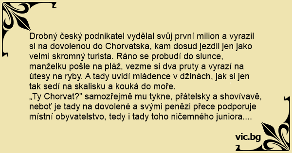 Čech si připraví pruty, nahodí je do moře a kývne na Chorvata: „Ty, Drago, když už tady tak sedíš, proč si taky nekoupíš prut a nechytáš?”