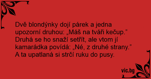 Dvě blondýnky dojí párek a jedna upozorní druhou: „Máš na tváři kečup.”