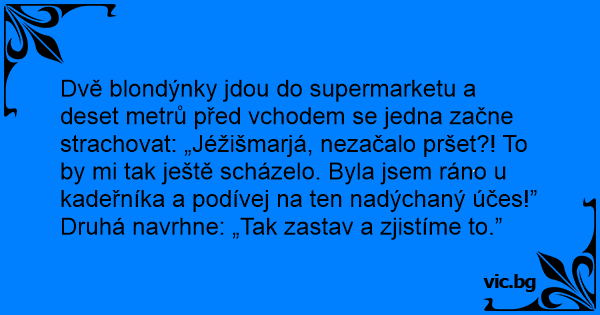 Dvě blondýnky jdou do supermarketu a deset metrů před vchodem se jedna začne strachovat: „Jéžišmarjá, nezačalo pršet?! To by mi tak ještě scházelo. Byla jsem ráno u kadeřníka a podívej na ten nadýchaný účes!”