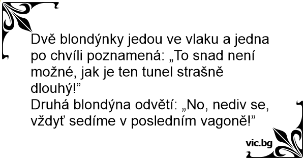 Dvě blondýnky jedou ve vlaku a jedna po chvíli poznamená: „To snad není možné, jak je ten tunel strašně dlouhý!”