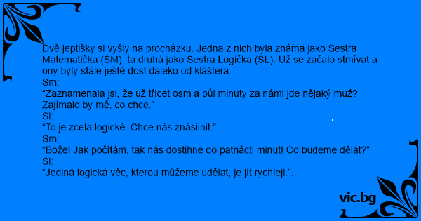 Dvě jeptišky si vyšly na procházku. Jedna z nich byla známa jako Sestra Matematička (SM), ta druhá jako Sestra Logička (SL). Už se začalo stmívat a ony byly stále ještě dost daleko od kláštera.