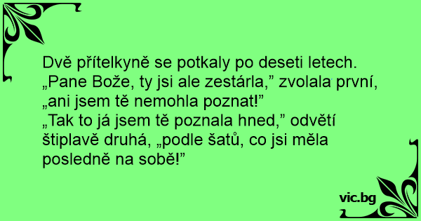 „Tak to já jsem tě poznala hned,” odvětí štiplavě druhá, „podle šatů, co jsi měla posledně na sobě!”