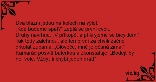 Kamarád posvítí baterkou a zkonstatuje: „Bodejť by ne, vole. Vždyť ti chybí jeden drát!”