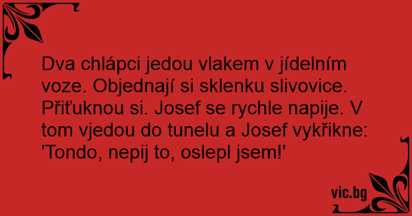 Dva chlápci jedou vlakem v jídelním voze. Objednají si sklenku slivovice. Přiťuknou si. Josef se rychle napije. V tom vjedou do tunelu a Josef vykřikne: