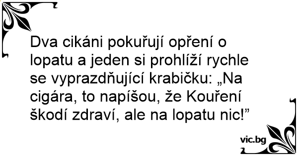 Dva cikáni pokuřují opření o lopatu a jeden si prohlíží rychle se vyprazdňující krabičku: „Na cigára, to napíšou, že Kouření škodí zdraví, ale na lopatu nic!”