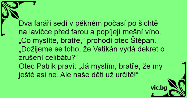 „Co myslíte, bratře,” prohodí otec Štěpán. „Dožijeme se toho, že Vatikán vydá dekret o zrušení celibátu?”