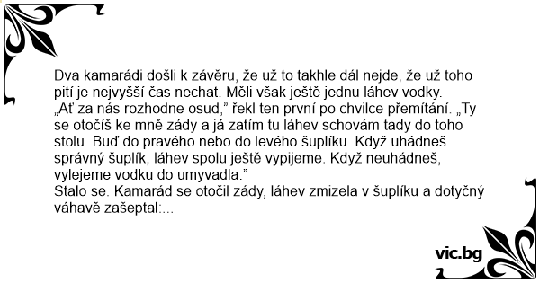 „Ať za nás rozhodne osud,” řekl ten první po chvilce přemítání. „Ty se otočíš ke mně zády a já zatím tu láhev schovám tady do toho stolu. Buď do pravého nebo do levého šuplíku. Když uhádneš správný šuplík, láhev spolu ještě vypijeme. Když neuhádneš, vylejeme vodku do umyvadla.”