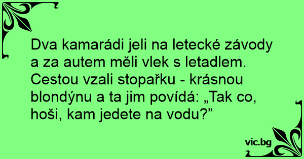 Dva kamarádi jeli na letecké závody a za autem měli vlek s letadlem. Cestou vzali stopařku - krásnou blondýnu a ta jim povídá: „Tak co, hoši, kam jedete na vodu?”