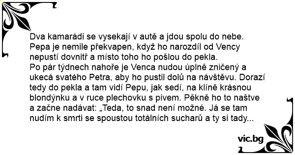 Po pár týdnech nahoře je Venca nudou úplně zničený a ukecá svatého Petra, aby hо pustil dolů na návštěvu. Dorazí tedy do pekla a tam vidí Pepu, jak sedí, na klíně krásnou blondýnku a v ruce plechovku s pivem. Pěkně hо to naštve a začne nadávat: „Teda, to snad není možné. Já se tam nudím k smrti se spoustou totálních sucharů a ty si tady takhle hovíš!”