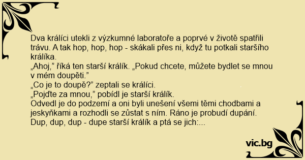 Tak jdou a po celé tři dny si užívají - dupky, dupky, dupky. Ale pak přijde první králík za tím druhým a povídá: „Člověče, já odsaď musím vypadnout.”