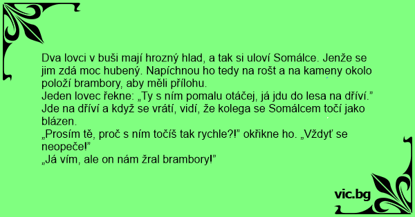 Jeden lovec řekne: „Ty s ním pomalu otáčej, já jdu do lesa na dříví.”