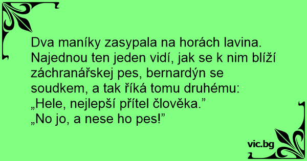 Dva maníky zasypala na horách lavina. Najednou ten jeden vidí, jak se k nim blíží záchranářskej pes, bernardýn se soudkem, a tak říká tomu druhému: „Hele, nejlepší přítel člověka.”