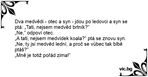 Dva medvědi - otec a syn - jdou po ledovci a syn se ptá: „Tati, nejsem medvěd brtník?”