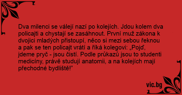 Dva milenci se válejí nazí po kolejích. Jdou kolem dva policajti a chystají se zasáhnout. První muž zákona k dvojici mladých přistoupí, něco si mezi sebou řeknou a pak se ten policajt vrátí a říká kolegovi: „Pojď, jdeme pryč - jsou čistí. Podle průkazů jsou to studenti medicíny, právě studují anatomii, a na kolejích mají přechodné bydliště!”