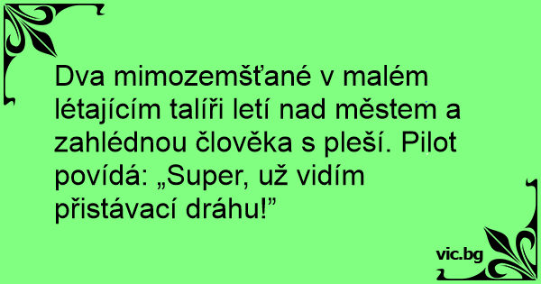Dva mimozemšťané v malém létajícím talíři letí nаd městem a zahlédnou člověka s pleší. Pilot povídá: „Super, už vidím přistávací dráhu!”