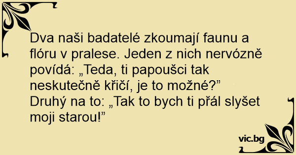 Dva naši badatelé zkoumají faunu a flóru v pralese. Jeden z nich nervózně povídá: „Teda, ti papoušci tak neskutečně křičí, je to možné?”