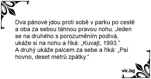 Dva pánové jdou proti sobě v parku po cestě a oba za sebou táhnou pravou nohu. Jeden se na druhého s porozuměním podívá, ukáže si na nohu a říká: „Kuvajt, 1993.”